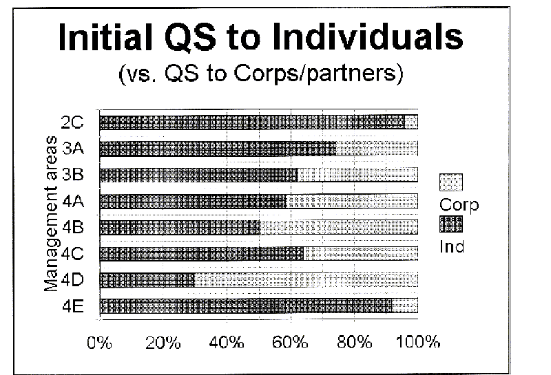Large percentages of QS holders had relatively small holdings. In most management areas most persons initially received a half percent or less of the initial allocation of QS. In two areas, 2C and 3A, everyone did. In six areas, the number of persons receiving 0.5% or less was a majority. In Areas 4C and 4D, they made up a third of the recipients.