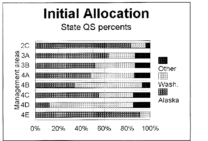 Community Development Quota (CDQ) allocations were made from the TACs in management Areas 4B, 4C, 4D, and 4E. QS recipients in these areas were compensated for their reduced harvests by being given a one time initial allocation of QS in each of the non-CDQ management areas.